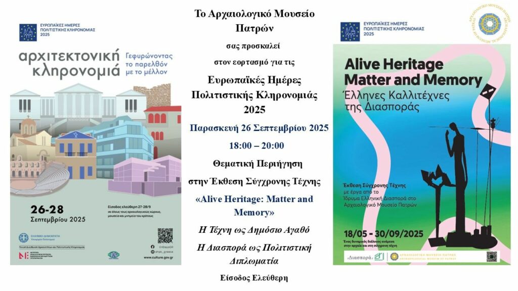 «Alive Heritage: Matter and Memory» Στο πλαίσιο του εορτασμού των Ευρωπαϊκών Ημερών Πολιτιστικής Κληρονομιάς 2025, με θέμα: «Αρχιτεκτονική Κληρονομιά – Γεφυρώνοντας το παρελθόν με το μέλλον», το Αρχαιολογικό Μουσείο Πατρών συμμετέχει με ένα ιδιαίτερο πρόγραμμα θεματικών περιηγήσεων στο πλαίσιο της Έκθεσης Σύγχρονης Τέχνης «Alive Heritage: Matter and Memory». Η Εφορεία Αρχαιοτήτων Αχαΐας – το Αρχαιολογικό …